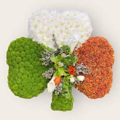 A luscious green 2D Shamrock shaped tribute with a beautiful floral spray.