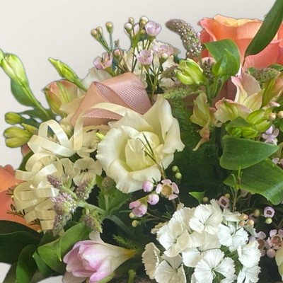 This lovely hatbox arrangement is made with a mix of seasonal flowers such as roses, alstroemeria, germinis, sweet william with scented foliage.
