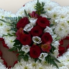 This lovely based open double heart arrangement comes with a ribboned edge and matching floral spray.