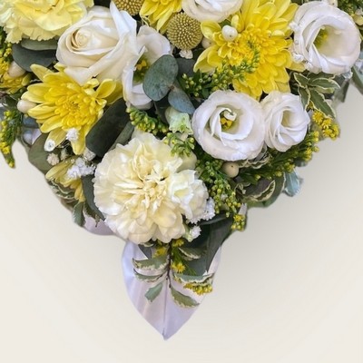 Beautiful closed heart tribute in a mix of yellow and white seasonal flowers.