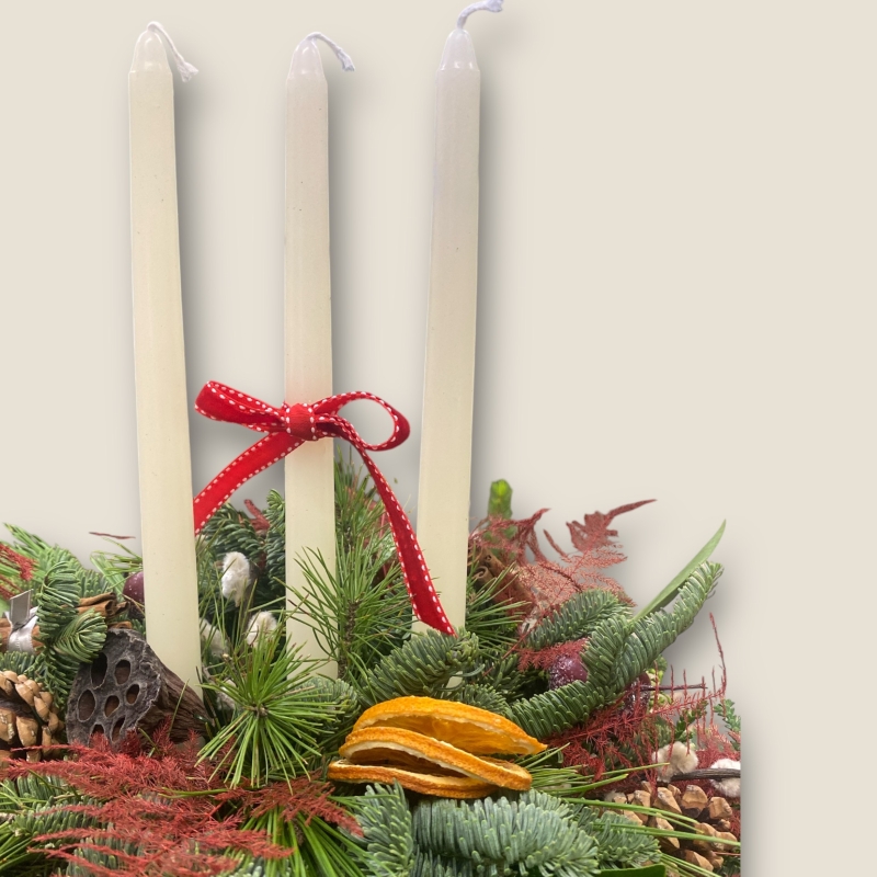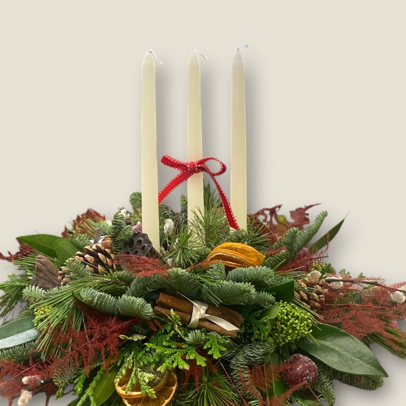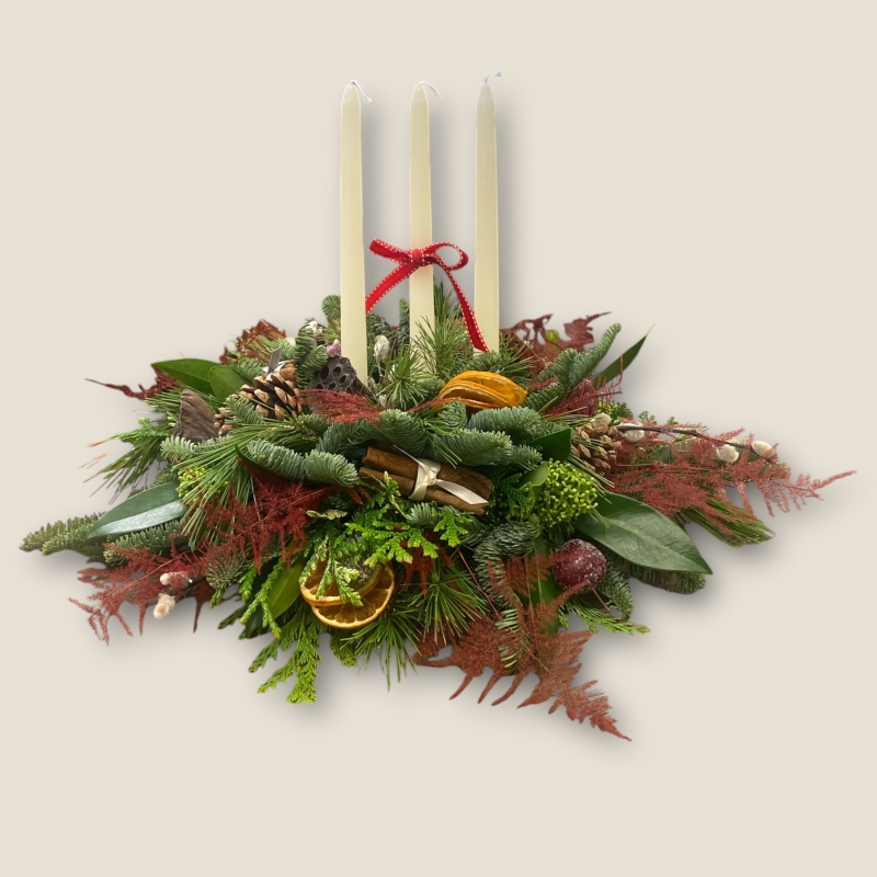 This lovely Christmas table arrangement comes with three taper candles and is made with a mix of seasonal foliages, fruit, pine cones, pussy willow, lotus heads and red asparagus fern. 24" wide