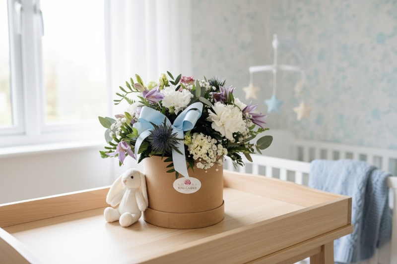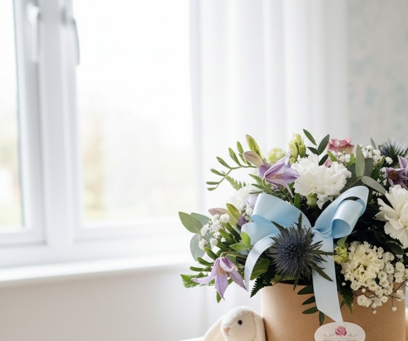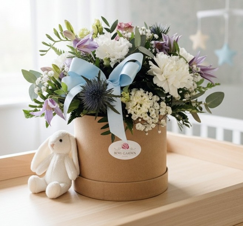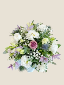 This lovely hatbox is arranged in floral foam and made with a mix of seasonal flowers in lilacs, blues and whites.