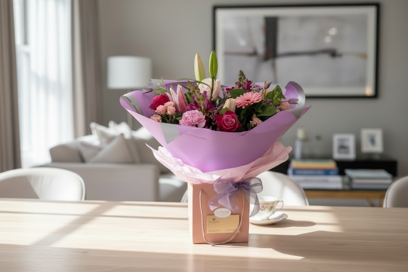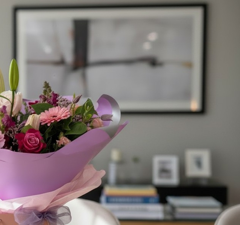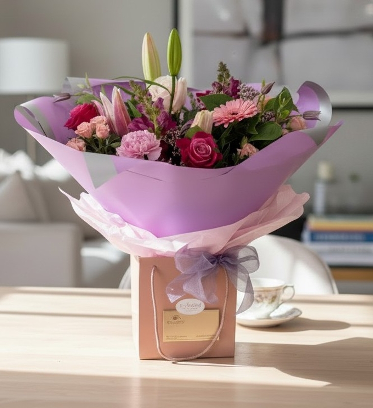 This lovely hand tied bouquet is made with a mix of blush, pink, cerise and lilac seasonal flowers with scented foliage.
