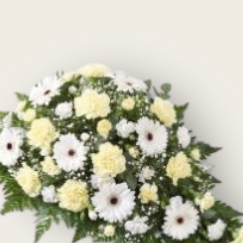 This lovely single ended teardrop spray makes a beautiful arrangement. Made in a mix of seasonal flowers in lemon and white.