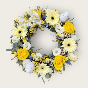 This beautiful table wreath in yellow and white, decorated with eggs is the perfect thing for your Easter lunch table.
