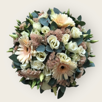 Loose mixed posy in a mix of peach and white seasonal flowers with mixed foliage.
