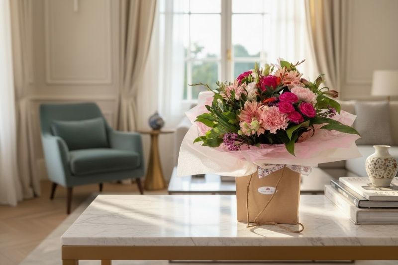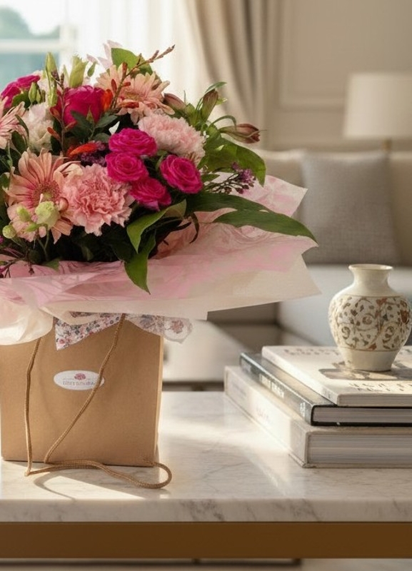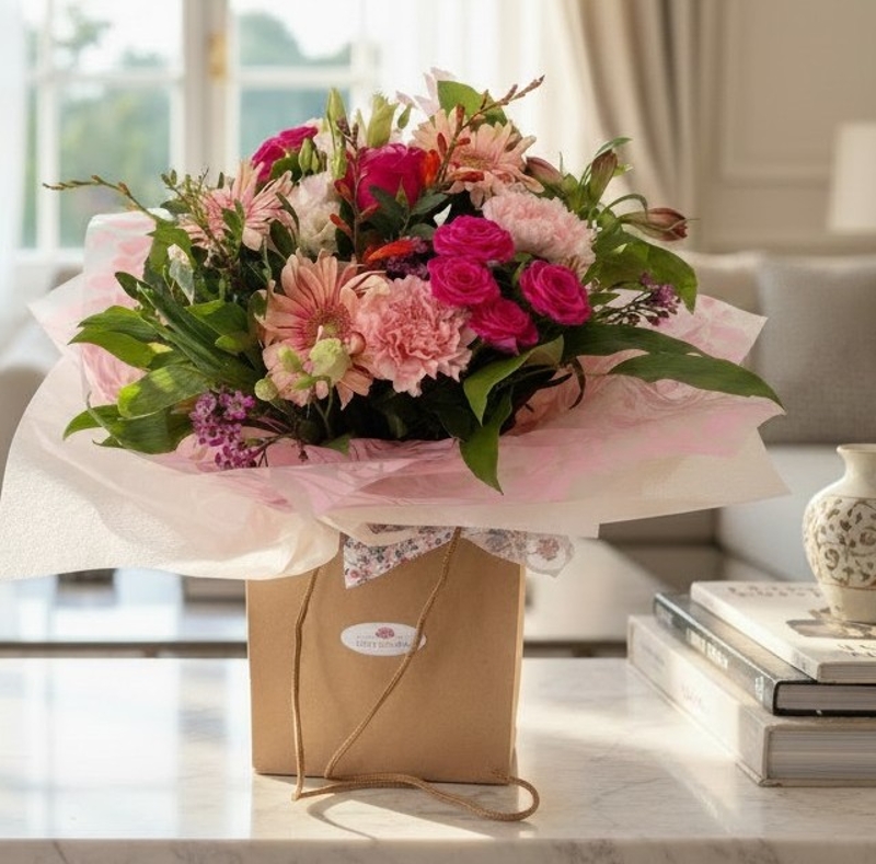 Gorgeous luxury hand tied aqua packed bouquet in a mix of cerise, pink, peach and orange with a mix of seasonal foliage.