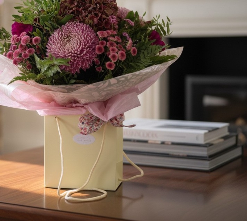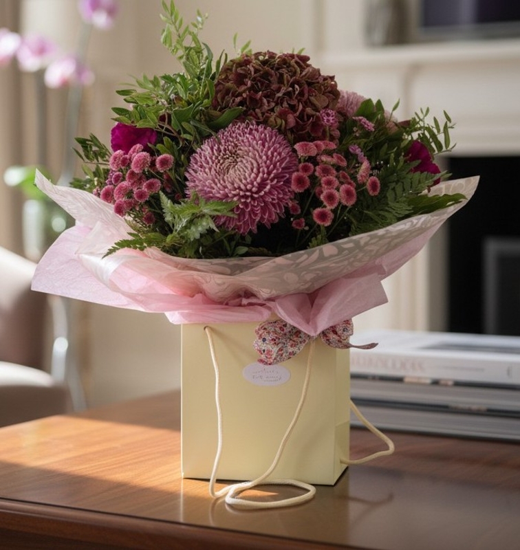 This large luxury bouquet is made with a mix of rustic hydrangeas, blooms and seasonal flowers with a mix of autumnal foliage.