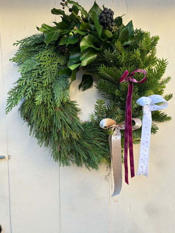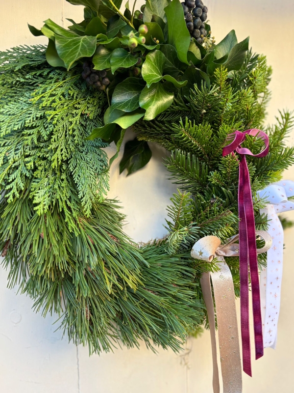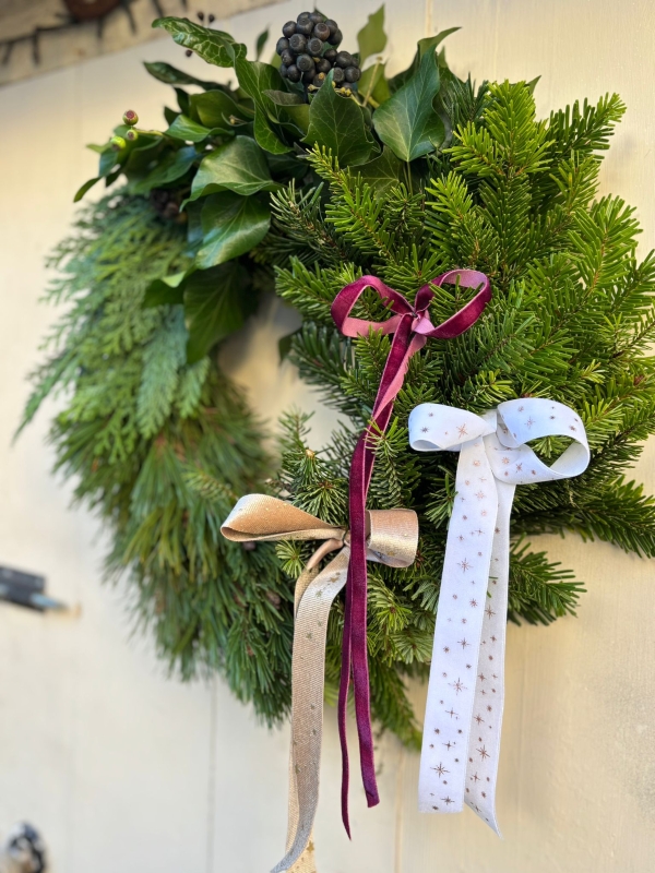 A soft, elegant sweep of cedar, fir and pine, hand-tied with trailing ribbons for a gentle, storybook finish. This wreath is all about natural beauty, calm, textural and quietly luxurious. Perfect for country cottages, period doorways and anyone who loves understated Christmas charm.