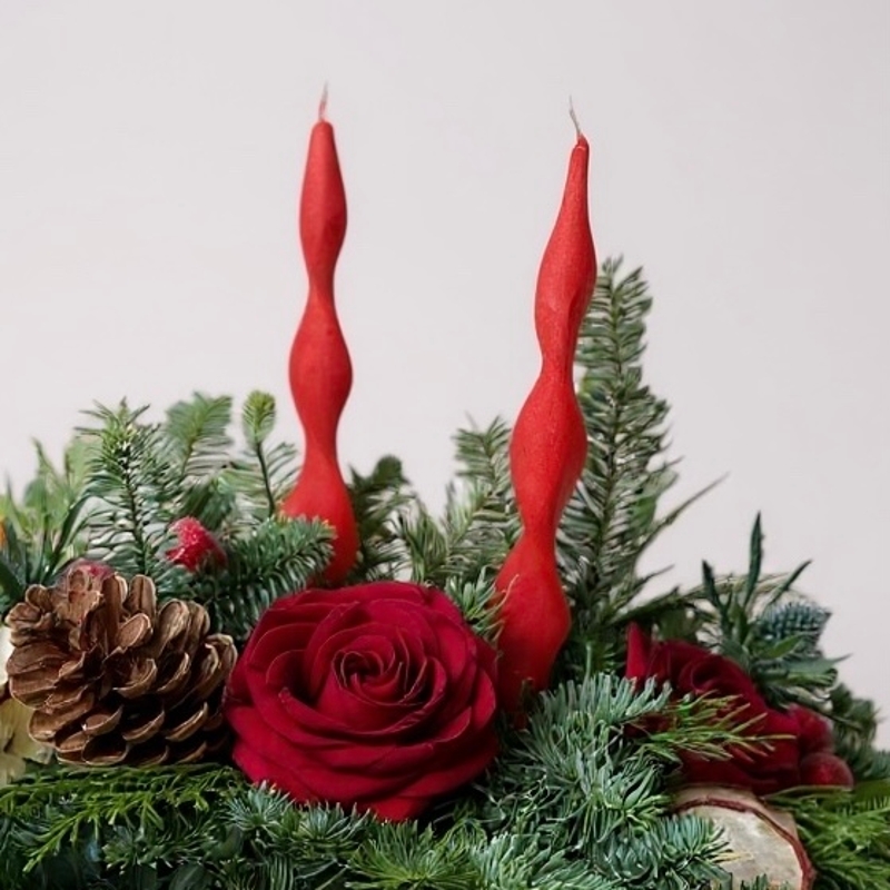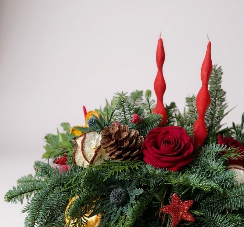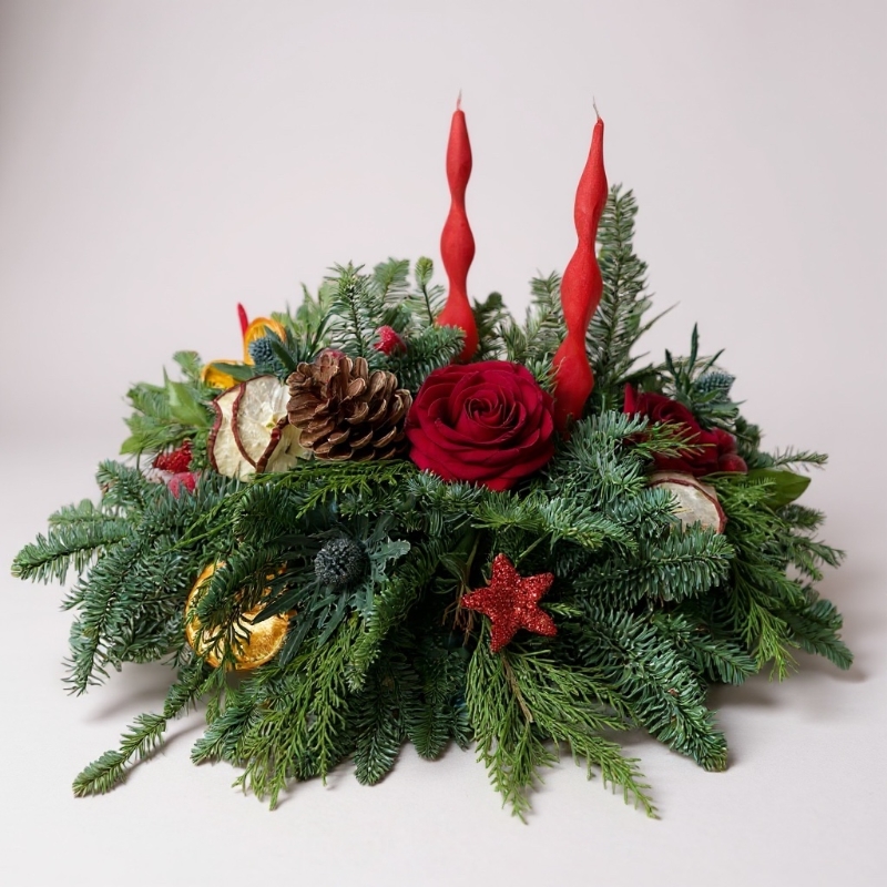 This lovely Christmas table arrangement is approximately 18 inches wide and is made with a mix of seasonal foliage, dried fruit, berries, cones and red roses with two red candles.