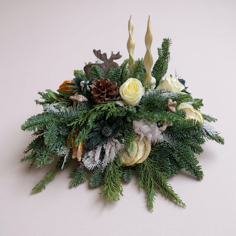 This lovely Christmas table arrangement is approximately 18 inches wide and is made with a mix of seasonal foliage, dried fruit, berries, cones and white roses with two gold candles.