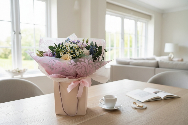 A luxurious hand-tied bouquet of soft, elegant blooms, arranged to feel like a warm embrace. Perfect for when you want your Mother’s Day flowers to feel extra meaningful.